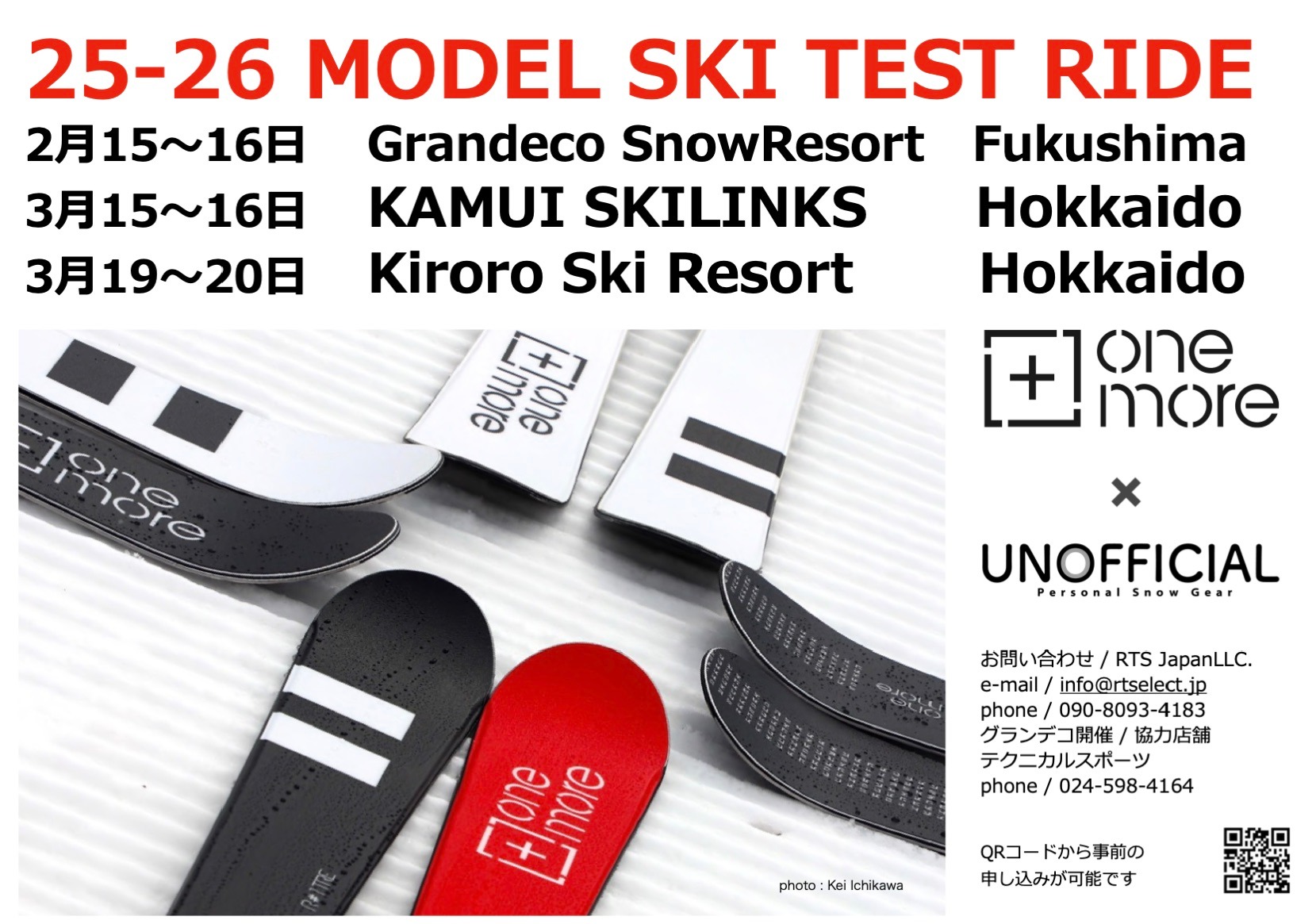 いよいよ今年もTEST RIDE のシーズンが来ました。第一回は、2月15日(土)〜16日(日)グランデコスノーリゾートにて開催いたします。当日はHand made in Italy のOneMore スキー試乗のほか、UNOFFICIAL PSG.スキーポールもお試しいただくことが可能です。この機会に是非ご利用ください。